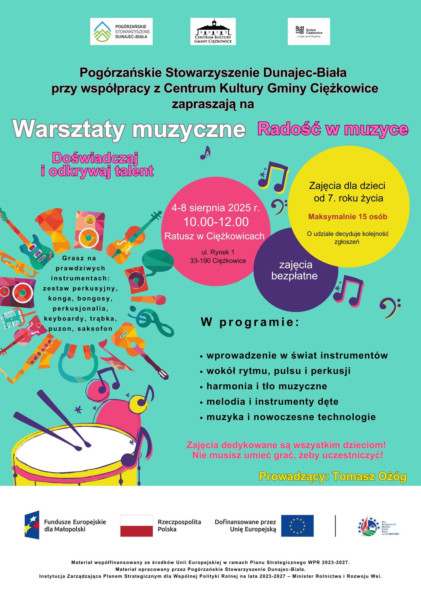 Pogórzańskie Stowarzyszenie Dunajec-Biała oraz Centrum Kultury Gminy Ciężkowice zapraszają dzieci od 7. roku życia na wyjątkowe, bezpłatne Warsztaty muzyczne Radość w muzyce!